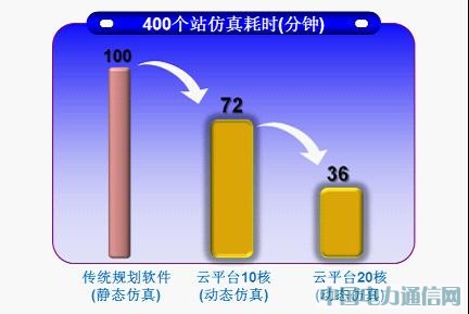 目前我們內(nèi)部建立的云平臺采用業(yè)界先進的分布式集群作業(yè)調(diào)度的工作模式,可以支持大量并行作業(yè),提供7*24小時自動負載均衡的計算服務,已經(jīng)具備104臺高性能刀片服務器,總計1216核心的計算能力。現(xiàn)場工作人員通過遠程的方式利用云平臺完成所有的計算,提取前臺所需要的技術(shù)進行現(xiàn)場實際部署時所需要的數(shù)據(jù)。同時,結(jié)合基于web的用戶管理和訪問機制為用戶數(shù)據(jù)的安全性提供了充分保護。經(jīng)過統(tǒng)計,400個站址的仿真耗時為:傳統(tǒng)規(guī)劃軟件需要100min,10核的云平臺需要72min,20核的云平臺則只需36min(如圖5所示)。由此可見,云計算模式的高效性極其可觀。