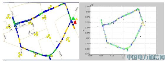 關于仿真建模中的UE分布,LTE云規(guī)劃解決方案可以允許實際測試路線的導入,結(jié)合實際地形,使得仿真與測試環(huán)境更加接近。圖9為實際測試路線及仿真建模的UE分布。