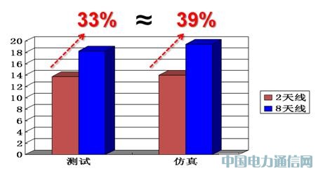 關于2/8天線對比的需求來自《TD-LTE規(guī)模技術(shù)試驗——六城市測試——2/8天線對比測試規(guī)范》。LTE云規(guī)劃解決方案可以進行真實高效的動態(tài)仿真,并指導測試,滿足規(guī)劃和測試方面的各種需求。下圖為LTE動態(tài)仿真云平臺的仿真結(jié)果,8天線針對兩天線有39%的吞吐量提升,與真實外場測試的吞吐量提升結(jié)果比較接近。