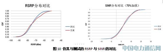 在保證了仿真建模與測試匹配的前提下,即可進行仿真與測試的RSRP與SINR的對比,如圖10所示。從結(jié)果來看,LTE云規(guī)劃解決方案可以達到與測試較好的擬合程度。