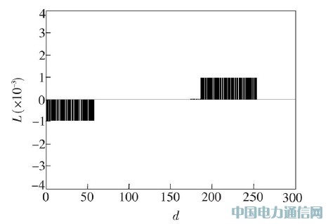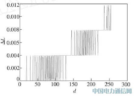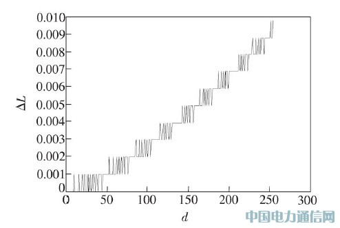 圖5 中的橫向坐標仍為屏幕顯示的8 bit 顯示數據(d):0~255 ;縱坐標為這些顯示數據對應的具有10 bit 灰度等級顯示精度的屏幕顯示的相對亮度數值之間的灰度級差(ΔL).