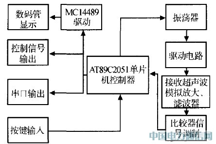 超聲波測(cè)距系統(tǒng)包括4個(gè)部分,即①發(fā)射電路中振蕩器驅(qū)動(dòng)控制電路;②接收電路中模擬放大、濾波、信號(hào)調(diào)制電路;③數(shù)碼管顯示電路;④單片機(jī)系統(tǒng)及其串口輸出、控制信號(hào)輸出、按鍵輸入部分。其方框圖如圖2所示。