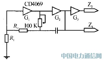 電路中G2輸出的電壓由于 ,的調(diào)節(jié),可以改變輸入到G1輸入端的相位。當(dāng)相位達(dá)到同相時(shí),G1和G2實(shí)現(xiàn)正反饋,G1和G2就成了穩(wěn)定的振蕩器。振蕩周期公式為T=2.2×Rf×C.因?yàn)镃D4069為CMOS結(jié)構(gòu),所以邏輯門前的電阻RP為G1的保護(hù)電阻。當(dāng)RP足夠大時(shí),G1的輸入電流可忽略不計(jì)。