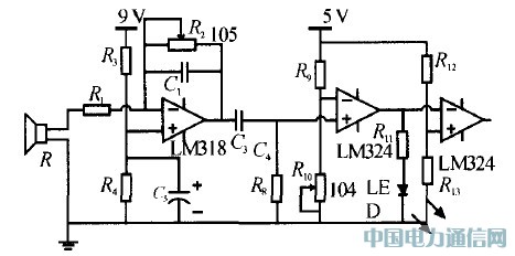 超聲波接收單元中包括:模擬放大、濾波電路、電平轉(zhuǎn)換電路,如圖5所示。模擬放大器選用高精度儀用放大器LM318作為信號(hào)放大與濾波之用,它的單位增益帶寬為15 MHz,超出音頻范圍能夠滿足40 kHz的要求。在放大電路的負(fù)反饋回路中接入電容C1構(gòu)成低通濾波器。電容的選擇可由公式。f=1/2πRfC求出,式中f0為采用的超聲波頻率,Rf為第一級(jí)的反饋電阻。因?yàn)槎嘀C振蕩器中有高頻分量噪聲,所以通過低通濾波器將高頻噪聲濾掉。經(jīng)過2極放大后,通過電容耦合,信號(hào)與參考電壓比較產(chǎn)生高低電平,提供給單片機(jī)產(chǎn)生中斷。參考電壓設(shè)定為1 V左右,以提高靈敏度。第2個(gè)比較器僅起反相作用 .