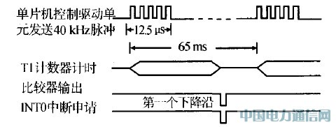 發(fā)射的超聲波被調(diào)制成包含40 kHz方波的具有一定時(shí)間間隔的矩形波脈沖信號(hào),其發(fā)射、接收脈沖工作時(shí)序圖如圖7所示。由單片機(jī)AT89C2051的P1.7口控制H橋電路的使能端EN,送出40 kHz的超聲波脈沖信號(hào),其脈沖寬度及脈沖間隔均由軟件控制。脈沖寬度約為125~200us,即在一個(gè)調(diào)制脈沖內(nèi)包含5~8個(gè)40 kHz的方波。脈沖發(fā)送間隔取決于要求測(cè)量的最大距離。若在有效測(cè)距范圍內(nèi)有被測(cè)物體,則在后一次超聲波束發(fā)出之前應(yīng)當(dāng)接收到前一次發(fā)射的反射波,否則認(rèn)為前方無被測(cè)物體。因此,按有效測(cè)距范圍可以估算出最短的脈沖間隔發(fā)送時(shí)間。例如:最大測(cè)距范圍為10m時(shí),脈沖間隔時(shí)間t:2s/v=2×10/340≈60ms,實(shí)際應(yīng)取t≥60 ms.本系統(tǒng)為方便起見,選擇脈沖間隔定時(shí)器為65 ms.