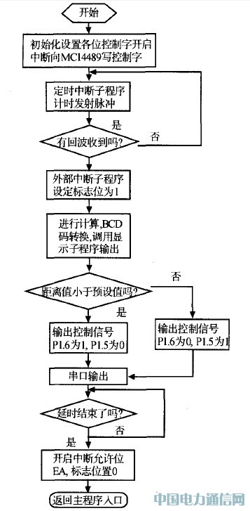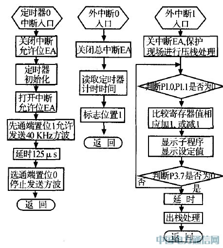 該系統(tǒng)軟件采用8051匯編語言編寫,主程序流程圖如圖8所示。AT89C2051單片機(jī)有2個(gè)外中斷口,分別用于接收回波中斷和按鍵輸人中斷,對(duì)應(yīng)2個(gè)外中斷子程序。此外,還用到了內(nèi)部中斷定時(shí)器, 它用于控制發(fā)送載波脈沖,如圖9所示。 定時(shí)器65 ms產(chǎn)生中斷一次,主要是發(fā)送載波脈沖和計(jì)數(shù)器清零。外中斷0將在有下降沿觸發(fā)時(shí)產(chǎn)生中斷,用于讀取定時(shí)器產(chǎn)生的計(jì)時(shí)值和使標(biāo)志位置位。外中斷1是按鍵輸人中斷,用于提供比較值來輸出控制信號(hào)。S0第一次觸發(fā)為中斷產(chǎn)生信號(hào),再次觸發(fā)則為輸入確定信號(hào)。S1和S2按鍵是輸入值增加和減少按鍵,它們通過判斷對(duì)應(yīng)的10口狀態(tài)來確定是否輸入。