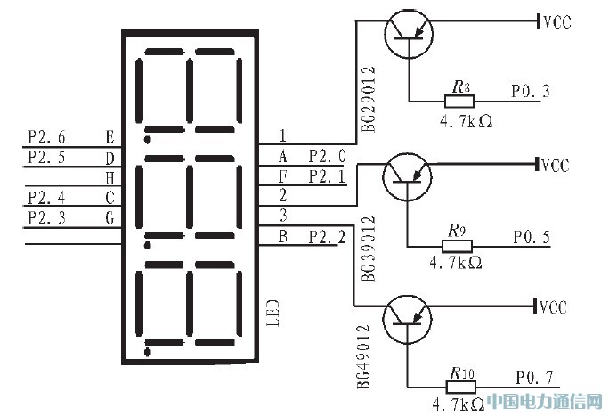 在顯示模塊選擇時有兩種,一種是用液晶顯示屏,其具有輕薄短小,分辨率高,可顯示漢字等各種符號的優點。但一般需要利用控制芯片創建字符庫,編程工作量大;一種則是選用數碼管,數碼管具有低電耗、壽命長、易于維護的特點,同時精度比較高,稱量快,精確可靠,編程容易,操作簡單。缺點是不能實現漢字及多數據多行顯示。綜合考慮本次設計中選擇了3位數碼管顯示。用PNP型三極管驅動數碼管,并連接到單片機AT89C52的P0口上作位選。雖然顯示上沒有液晶顯示屏那么完全,但是也能夠完整直觀地顯示出需要的結果。圖5為超聲波測距硬件設計的顯示電路。