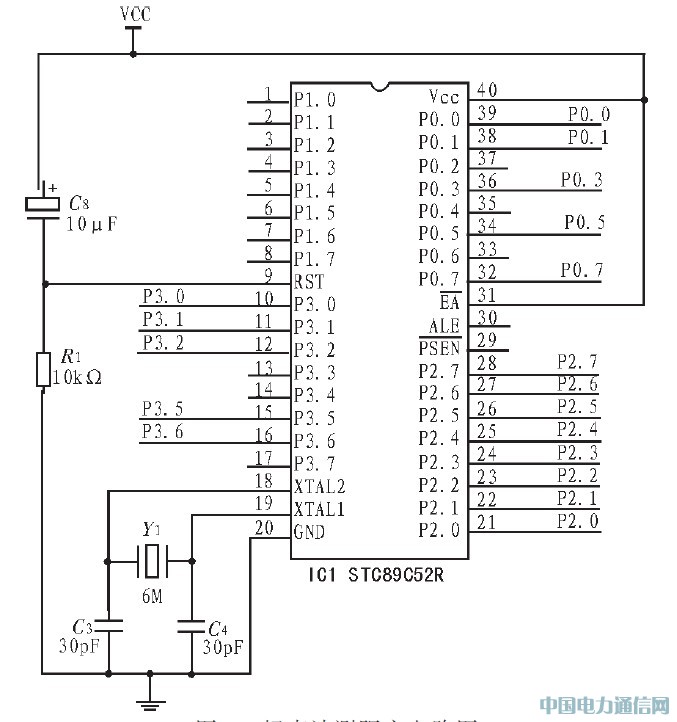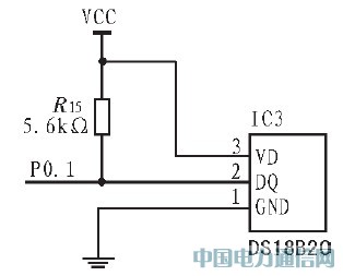 溫度補償電路的設計如圖6所示,數據輸入/輸出腳連接到單片機的P0.1腳,電源接口接入+5 V的電壓,外加5.6 kΩ的上拉電阻,因為DS18B20是單總線溫度傳感器,數據線是漏極開路,如果DS18B20沒接電源,則需要數據線強上拉,給DS18B20供電;如果DS18B20接有電源,則需要一個上拉即可穩定的工作。由于DS18B20在使用中不需要任何外圍元件,全部傳感元件及轉換電路集成在形如一只三極管的集成電路內,檢測的溫度值在內部進行轉換,溫度測量結果直接以數字信號輸出,單片機對由DS18B20輸出的信號進行讀取,經過軟件對溫度數字值實現處理。