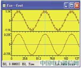 仿真圖形如圖3、圖4、圖5所示:圖3上半部分是濾波前的波形,下半部分是濾波后的波形。