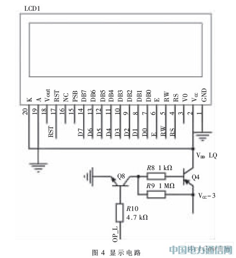 LCD顯示模塊對卡號、現有熱量、本次所購熱量等信息進行顯示。考慮到系統的低功耗,選用LCD12864芯片,其電路如圖4所示。它可以在3 V電壓下工作,不僅能顯示英文字符,還能顯示漢字,做到了信息的全中文顯示。不開啟背光,工作電流典型值也只有1.2 mA,在平時不顯示的時候關閉模塊電源,使顯示模塊消耗的能量很少,完全適合電池供電的低功耗系統。