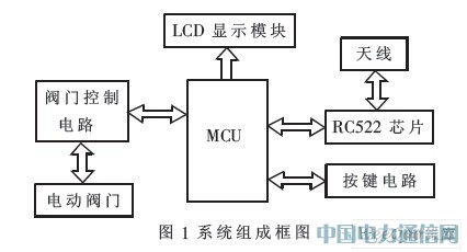 系統工作原理:當需要讀卡操作時,先由按鍵電路把單片機從低功耗模式喚醒,單片機收到有效讀卡信息后打開射頻卡讀寫電路的電源,對進入射頻場的IC卡請求應答,當判斷有本系統的IC卡后進行通信,讀取卡中的熱量值,加到熱量表原有的熱量值中,對所購熱值和現有熱值進行存儲,并把IC卡中的熱量值清零,同時在LCD顯示器中顯示IC卡號、本次購買熱量和熱量表現有熱量等信息。若讀取IC卡之前熱量表中的熱值為0,讀取后現有熱值大于0,則打開閥門控制電路的電源,執行打開供暖管道進水口的操作,當微處理器檢測到閥門有效打開后,關閉閥門控制電路的電源。系統對射頻場掃描一段時間后關閉射頻讀寫模塊的電源。