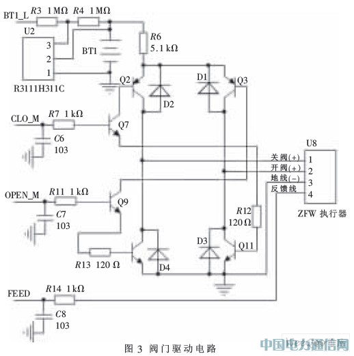 驅動電路主要控制閥門電機的轉動方向,當需要開閥或關閥操作時,打開相應的電路即可。當檢測到閥門已打開或已關閉后,關閉電路的電源,以降低功耗。如圖3所示,關閥電路(Q2,Q7,Q11)受CLO_M端控制,當CLO_M為高電平時,Q2、Q7、Q11導通,關閥端為高電平,開閥端為低電平,執行關閥操作。當檢測到反饋端的電平變為低時使CLO_M端為低,切斷電源;開閥電路(Q9、Q10、Q3)受OPEN_M端控制,工作過程和關閥過程類似。