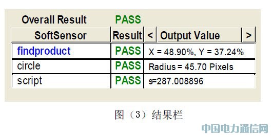 Script程序中的第一個命令就是寫小孔半徑到智能圖像傳感器的第100號寄存器。第二個命令就是讀取第200號寄存器的數據,將該數據乘以2×3.14賦給script傳感器輸出小孔周長。然后這個值就可以在result table顯示出來。見圖(3)所示。