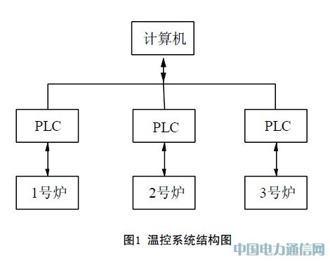 在鍋爐溫度控制系統中,電加熱鍋爐是過程控制工業中常用的設備,其溫度控制也是過程控制的一個重點。PLC溫度控制系統的結構如圖1所示,PLC 通過加熱棒及風扇分別控制爐子的加熱及降溫。計算機則實現目標溫度的設定、動態顯示、參數的設定等功能,從而實現實時溫度監控。