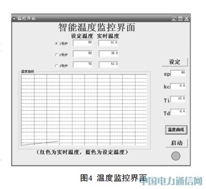 MSComm1.PortOpen= True//打開通信端口。計算機端的VB程序利用MSComm 控件與S7-200交換數據,通過自由口通訊程序從現場采集溫度信號。并且上位機程序可以設定初始溫度和PID參數、顯示動態溫度曲線。程序運行界面如圖4所示。