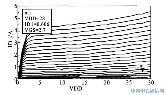 在晶體管的技術參數中,需要通過仿真和實際測試獲得柵極電壓。圖2 為MRF6S19060N 晶體管的靜態工作點特性曲線。在特性曲線中,可以發現靜態工作點即圖2 中m1 點,V DD= 28V, I DQ = 0.606A, 從而得到柵極電壓VGS = 2. 7V, 這樣靜態工作點就確定了。