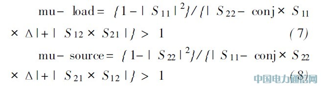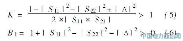 放大器電路必須滿足的首要條件之一是其在工作頻段內的穩定性。因為射頻電路在某些工作頻率和終端條件下有產生振蕩的趨勢。它一般取決于晶體管的S 參數和置端條件。功率放大器的穩定性可以根據穩定因子來判定,計算公式如下: