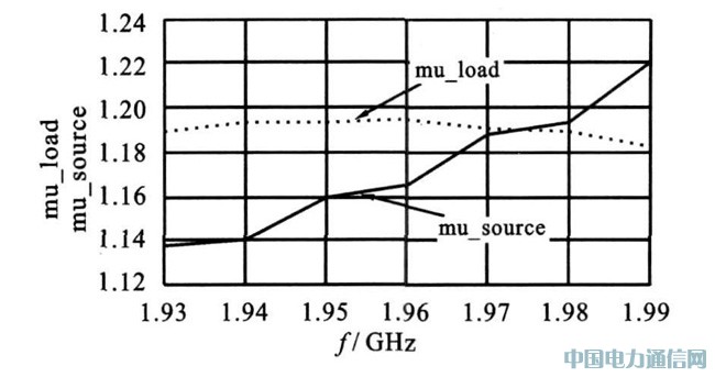 如果因不穩定在輸入或輸出端口出現負阻時,就可能發生振蕩,則需要采用在輸入或輸出端串聯或并聯負反饋的方法使晶體管穩定。仿真實例中采用ADS 自帶mu- load 和mu- source 公式滿足的條件來判定功率放大器穩定性,通過仿真可以得到器件的穩定性曲線如圖3 所示。由下圖仿真結果可見在工作頻率范圍內mu- load 和mu- source 都大于1 滿足絕對穩定的條件。