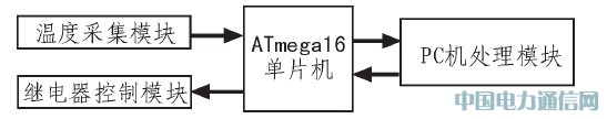 本系統(tǒng)由溫度采集模塊,固態(tài)繼電器控制模塊,單片機模塊,PC機軟件處理模塊。4個模塊加起來實現(xiàn)溫度的控制,以及溫度采集和溫度經過軟件處理的分析。它們的邏輯關系如圖1所示。