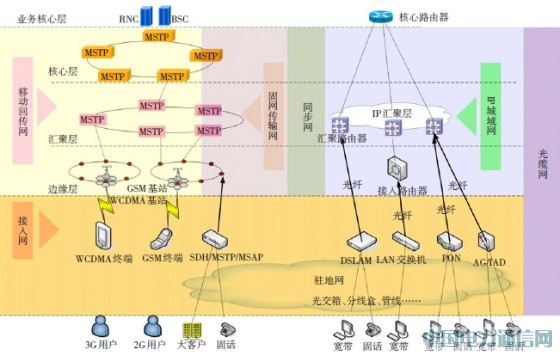 目前,我國各運營商的城域網主要包括本地傳輸網、IP城域網、寬帶接入網等,其中本地傳輸網包括移動回傳網和固網傳輸網2個部分。具體網絡結構詳見圖1。
