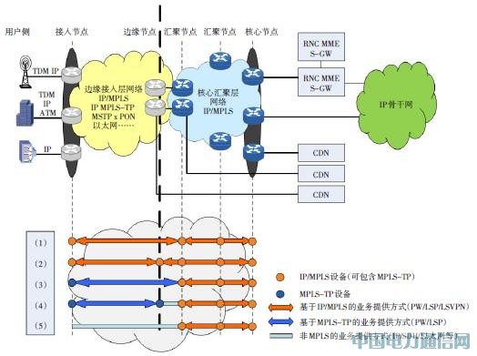 圖2中的(1)至(5)描述了從邊緣接入到核心匯聚網絡基于MPLS功能的位置及綜合業務承載網絡的應用范圍而提出的多種業務部署場景,這里不再贅述。