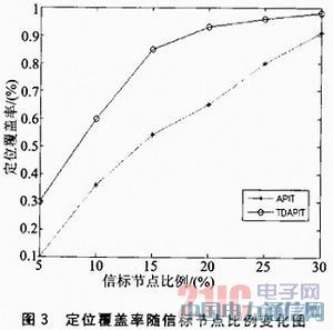 定位誤差隨信標(biāo)節(jié)點(diǎn)比例變化圖如圖4所示。該仿真結(jié)果說明,在網(wǎng)絡(luò)部署一定時(shí),當(dāng)兩種算法的定位誤差達(dá)到35%左右時(shí),兩者的定位精度很難再得到明顯改善。在信標(biāo)節(jié)點(diǎn)比例為5%左右時(shí),TDAPIT的定位誤差明顯大于APIT的定位誤差,這是因?yàn)樵诰W(wǎng)絡(luò)的初始階段,APIT可定位的節(jié)點(diǎn)數(shù)目較少,而TDAPIT能夠定位的節(jié)點(diǎn)相對(duì)較多,而且TDAPIT定位時(shí),利用了本身定位就有誤差的已知節(jié)點(diǎn),使得定位出的節(jié)點(diǎn)的誤差得到累加,明顯加大了定位誤差。當(dāng)信標(biāo)節(jié)點(diǎn)比例在20%左右時(shí),兩種算法的定位誤差變化不明顯,此時(shí)增加信標(biāo)節(jié)點(diǎn)比例時(shí),TDAP IT略顯優(yōu)秀,但定位誤差仍然在30%以上,由此可見這種非基于測(cè)距的定位方法雖然成本較低、實(shí)現(xiàn)簡單,但是定位誤差比較大,而且當(dāng)信標(biāo)節(jié)點(diǎn)比例達(dá)到30%時(shí),定位誤差仍然在30%以上,此時(shí)即使增加信標(biāo)節(jié)點(diǎn)的比例也很難改變定位誤差。