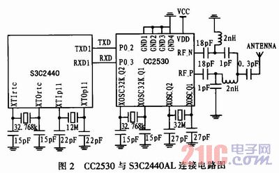 CC2530與S3C2440AL之間采用串口通信,其連接如圖2所示。CC2530的串行數(shù)據(jù)發(fā)送端P0_3與S3C2440AL的串行數(shù)據(jù)接收端RXD1相連,CC25 30的串行數(shù)據(jù)接收端P0_2與S3C2440AL的串行數(shù)據(jù)發(fā)送端TXD1相連。此處將CC2530的設(shè)備類型設(shè)置為協(xié)調(diào)器,實(shí)現(xiàn)無線接收各個(gè)傳感器節(jié)點(diǎn)發(fā)送的氣象數(shù)據(jù)。