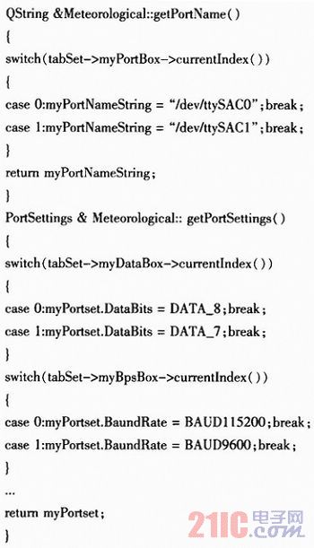 其中,getPortSettings()函數(shù)返回一個(gè)PortSettings型變量,包含了對波特率、數(shù)據(jù)位、停止位等的設(shè)置,getPortName()函數(shù)返回字符串型變量,用于串口號的設(shè)置。
