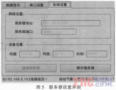 首次使用時(shí),在系統(tǒng)設(shè)置界面對服務(wù)器地址、服務(wù)器端口、經(jīng)度、緯度、臺站號進(jìn)行設(shè)置,在串口設(shè)置界面對串口的波特率、數(shù)據(jù)位、停止位等信息進(jìn)行設(shè)置。設(shè)置完成后連接服務(wù)器并打開串口,在數(shù)據(jù)顯示界面將會實(shí)時(shí)動態(tài)顯示各傳感器節(jié)點(diǎn)發(fā)來的氣象數(shù)據(jù)。與服務(wù)器的連接狀態(tài)等信息在程序狀態(tài)欄會有相關(guān)提示,一旦與服務(wù)器斷開,系統(tǒng)將會自動連接服務(wù)器并將這段時(shí)間內(nèi)收到的數(shù)據(jù)保存起來等待連接成功后重新發(fā)送。