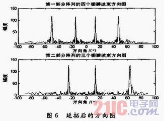 兩部分波束后的角度模糊分別有四個和三個柵瓣,把模糊角度的柵瓣對齊后,將兩部分對比,在相同位置有峰值的角度即為解模糊角。柵瓣波束方向圖如圖6所示。