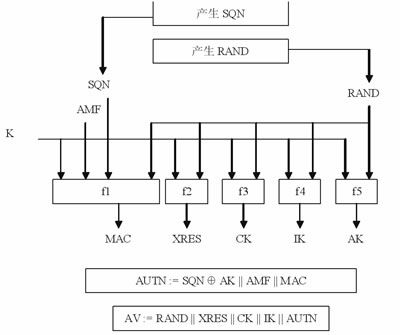 2.HLR/AuC首先產(chǎn)生一個(gè)隨機(jī)數(shù)RAND和一個(gè)SQN,然后基于這個(gè)RAND、SQN和用戶的根密鑰K按圖1所示進(jìn)行如下計(jì)算:用f2算法生成移動(dòng)臺(tái)應(yīng)返回的認(rèn)證響應(yīng)XRES,用f3算法生成加密密鑰CK,用f4算法生成完整性保護(hù)密鑰IK,用f1和f5算法生成網(wǎng)絡(luò)對(duì)應(yīng)的認(rèn)證響應(yīng)AUTN,HLR/AuC也可能產(chǎn)生多組這樣的認(rèn)證向量。