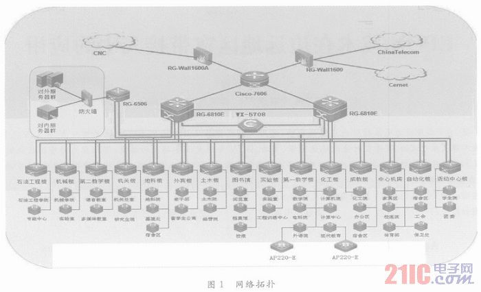 該網絡主要以有線和無線混合的模式,充分利用有線網絡的高帶寬,提高網絡的健壯性。各個AP通過雙絞線與樓層匯聚交換機相連,再通過光纖與中心機房的核心交換機連接。根據東北石油大學的物理分布和實際網絡結構特點,可選用無線控制器+“瘦”AP的無線網絡解決方案,整體劃一,系統管理,全面滿足學校的無線網絡應用需求,同時為今后的應用拓展(如無線WiFi電話,無線視頻組播等)做好充分的技術平臺準備。