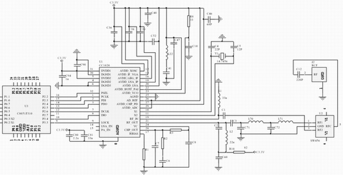 Chipcon公司提供了射頻部分的電路參考設(shè)計,射頻部分的布局參照了參考設(shè)計的布局,同時根據(jù)實(shí)際情況做了一些改動,以獲得最佳效果。CC1020的外圍元件很少,其中VCO電感屬于關(guān)鍵器件,選用了高精度電感,布局上也盡可能靠近芯片,并且盡可能使兩個輸入引腳對稱,以保證性能。另外,設(shè)計時讓晶振與芯片引腳盡量靠近,并用地線把時鐘區(qū)隔離起來,晶振外殼接地并固定,還使用了金屬罩對射頻部分進(jìn)行了電磁屏蔽。使用以上措施,保證了系統(tǒng)的可靠運(yùn)行。
