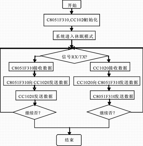 通信協(xié)議采用UART格式(一個開始位,負(fù)載數(shù)據(jù),一個結(jié)束位),另外,數(shù)據(jù)包前有同步碼,同步碼的作用是使接收端芯片正確識別UART格式的數(shù)據(jù)。之后要有識別碼,識別碼用來標(biāo)志數(shù)據(jù)開始,如果正確收到識別碼,說明可以正確接收數(shù)據(jù)。如果數(shù)據(jù)長度不是一定的,則在數(shù)據(jù)包開始部分加一個長度碼,或在數(shù)據(jù)包結(jié)尾部分加特定結(jié)束標(biāo)志。為了應(yīng)付無線傳輸中可能出現(xiàn)的數(shù)據(jù)錯誤,在數(shù)據(jù)包最后加一個校驗(yàn)碼,這樣就可以根據(jù)應(yīng)用需要選擇丟掉該包或是要求重發(fā)。實(shí)際應(yīng)用中發(fā)現(xiàn),在數(shù)據(jù)包之后,最好要有1~2個字節(jié)的冗余碼,否則,最后1個字節(jié)的數(shù)據(jù)很容易受到噪聲干擾,造成錯誤識別。主要流程框圖如圖2所示。