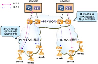 為滿足LTE時期相鄰基站間X2接口互聯和基站多歸屬(S1-Flex)的需求,PTN提供了核心層增強L3功能(PTN L3)和核心層對接CE路由器兩種解決方案,核心層增強L3功能的方案中由PTN完成橫向流量的轉發,核心層對接CE路由器的方案由CE路由器完成橫向流量的轉發。3.1 核心層PTN增強L3功能技術方案L3 PTN實現TD-LTE回傳組網圖1所示。L3 PTN方案中,PTN匯聚接入設備仍沿用現有的L2網絡,僅在核心設備引入簡化L3功能,通過靜態L3 VPN承載S1和X2業務。