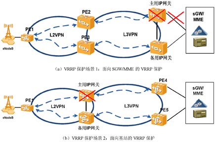 采用兩端PTN設備與SGW/MME對接,并配置為主備網關,當 PTN設備失效和接入鏈路失效時,如圖2(a)所示,主用網關將不可達,此時VRRP保護將默認網關IP映射為備用網關,而SGW/MME設備并不需要額外機制配合這種VRRP主備用網關切換。
