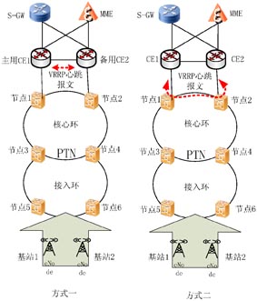 采用PTN+CE方案,在PTN和CE之間有兩種對接方式,分別是方式一PTN內部建立主備PW,和方式二PTN內部建立VPLS。采用方式一時,VRRP心跳報文運行在兩臺CE設備之間,為提高心跳報文鏈路可靠性,宜采用多鏈路捆綁方式實現。采用方式二時,VRRP心跳報文運行在PTN與CE互聯的鏈路上。