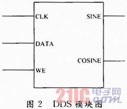 FPGA產(chǎn)生正弦波一般可以采用直接產(chǎn)生和Xilinx或者Altera利用自帶DDS的IP核例化實(shí)現(xiàn)。FPGA直接產(chǎn)生是將三角函數(shù)值存入ROM中循環(huán)調(diào)用來(lái)產(chǎn)生正弦波,這樣占用的邏輯資源比較少,缺點(diǎn)就是過(guò)程很麻煩而且不夠靈活,模型需要8種頻率的正弦波和余弦波,而且fm也可能根據(jù)需要而變化,每一次變化就需要在ROM中重新賦初值,十分麻煩。因此本文選擇調(diào)用Xilinx自帶DDS的IP核,通過(guò)邏輯資源換取效率。DDS的模塊圖如圖2所示。