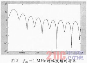 開(kāi)發(fā)板的工作時(shí)鐘為100 MHz,DDS IP核延遲2個(gè)時(shí)鐘周期有輸出值,乘法器延遲1個(gè)時(shí)鐘周期有輸出值,所以系統(tǒng)總共有3個(gè)時(shí)鐘周期的延遲。串口傳輸數(shù)據(jù)比較慢,而且數(shù)據(jù)量太大容易出錯(cuò),所以將工作時(shí)鐘分別進(jìn)行100倍分頻上傳衰落信道第一徑的25 000個(gè)數(shù)據(jù)進(jìn)行觀察,工作時(shí)鐘變成1 MHz,將所得的幅度譜轉(zhuǎn)化成功率形式后如圖3所示,fclk=1 MHz的Matlab仿真如圖4所示。