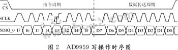 系統通過FPGA對AD9959進行操作,主要分為兩個階段,第一個階段為指令周期,在這個階段把指令寫入到AD9959中,在SCLK的每個上升沿寫入一個比特,并且這個指令字節規定了將要進行的傳輸到底是讀操作還是寫操作,同時包含了寄存器地址;第二個階段為數據傳送周期,主要傳送波形參數的控制字。