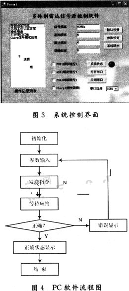 PC機軟件主要完成用戶參數的輸入并且將數據通過RS232串口發送到FPGA,程序采用C編寫,界面上可以輸入生成雷達信號的各種參數,比如信號頻率、起始頻率、截止頻率、調頻斜率,由于AD9959可以生成FSK,PSK,ASK多種體制信號,用戶還可通過下拉列表選擇信號樣式。系統控制軟件界百如圖3所示。