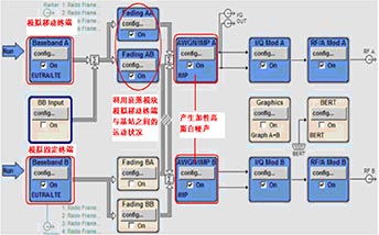首先,以LTE Release 8的網(wǎng)絡(luò)設(shè)備射頻測試為例,主要根據(jù)規(guī)范3GPP 36.141的第七章和第八章進(jìn)行測試。其中,第七章是基站接收測試,需要信號源能夠產(chǎn)生有用LTE信號、白噪聲信號、干擾信號,信號源SMU200A能夠在一臺源內(nèi)部同時(shí)實(shí)現(xiàn)所需的所有三種信號。第八章屬于基站性能測試部分,主要考察了基站在典型衰落場景下的工作性能和混合自動(dòng)重傳等功能。以3GPP 36.141 8.2.2“上行時(shí)延調(diào)整”測試?yán)秊槔摐y試?yán)谋尘笆菍蓚(gè)模擬終端信號輸入基站,這兩個(gè)終端一個(gè)是固定終端,另一個(gè)是移動(dòng)終端,移動(dòng)終端與基站之間的延時(shí)是不停變化的,基站為了能夠正確的接收移動(dòng)終端發(fā)射的數(shù)據(jù)包,需要將“混合自動(dòng)重傳(HARQ)”信息發(fā)送給移動(dòng)終端,移動(dòng)終端根據(jù)基站的反饋信號做發(fā)射時(shí)間的自動(dòng)調(diào)整,同時(shí)兩個(gè)終端的信號上都加載有加性高斯白噪聲信號,此時(shí)觀測基站吞吐率的變化是否滿足規(guī)范要求。3GPP給出的測試框圖如圖1所示。