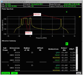 R&S公司提供的多種信號分析儀FSW,F(xiàn)SQ,F(xiàn)SV等都可以對LTE/LTE-A信號進(jìn)行解調(diào),以LTE-A為例,圖7中顯示的是對上一節(jié)中SMU200A產(chǎn)生的LTE-A信號的測試結(jié)果,發(fā)射配置是PUCCH和PUSCH同時(shí)發(fā)射,且PUSCH分簇發(fā)射。從圖7中可以看到,信號分析儀能夠正確解調(diào)出PUSCH和PUCCH信號的功率、EVM等指標(biāo)。