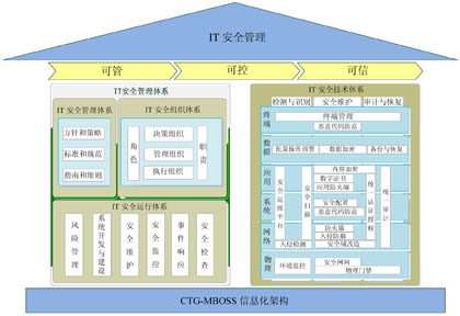 中國電信IT安全保障體系以CTG-MBOSS信息化架構為基礎,是支撐企業(yè)IT安全建設和管理的基礎架構,整個體系以IT安全戰(zhàn)略為指導,將組織、策略、運行、技術等安全各方面要素結合起來,通過安全管理制度的逐一落實,安全防護措施的統(tǒng)一部署,循序漸進的構建一個科學全面的信息安全保障體系。體系建設和實施路線遵循“管技結合、預防為主、注重長效、循序漸進”十六字方針,按照“職責明晰、預防為主、有效識別;主動防御、及時響應、集中管控;體系完善、流程通暢、全員參與” 的路線向“可管、可控、可信”三個階段能力目標演進,最終實現(xiàn)可信賴的IT安全運營環(huán)境愿景,整體安全保障體系框架如圖1所示。