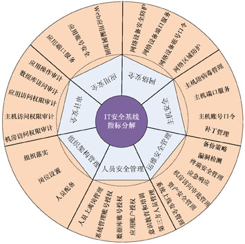 在實際操作中,IT安全基線達標測評采取打分的方式進行量化操作,對每一個檢測項打分,屬于判斷結果為“是”或“否”的檢測項,結果為“是”則評1分,為“否”則評0分。根據(jù)各項總分數(shù)對IT系統(tǒng)的安全評測結果分別進行等級化評定,IT安全基線能力基線視圖和判定方法如圖3所示。