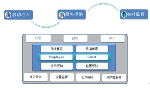傳統用戶的準入是通過單一的帳戶信息進行鑒權并獲得授權信息,但是在移動互聯時代,人們往往希望在企業內部單一帳戶可以應用到多個終端,(包括固定和移動的設備)。同時因此,網絡管理者,也必須在這種需求下調整網絡準入結構,比如,固定設備進行流量控制,移動設備進行時長控制;固定設備允許進入業務網,移動設備僅允許獲得瀏覽權限等。