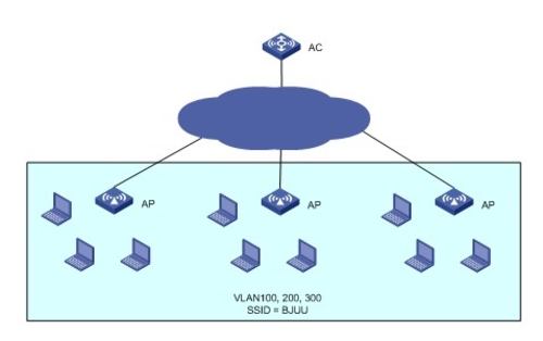 這種情況下如果將所有的用戶分配在一個VLAN中,意味著所有用戶在同一個子網中,龐大的廣播域會大大增加空口中的廣播流量,浪費空口帶寬。另一方面,大量用戶在同一子網中,那么該子網需要一個很大的連續地址空間。企業可能會有多個不連續的C類地址,但沒有大的連續地址空間(如B類地址)。顯然,我們無法利用一個VLAN來為大量的同一類用戶來分配不連續的地址空間。