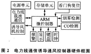 電力線通信誘導控制器硬件結構分為煙霧檢測、CO檢測、電力線載波通信、誘導風機控制、電源單元、時鐘單元、存儲單元、看門狗復位及鍵盤顯示等功能單元,如圖2所示。鍵盤主要進行系統控制參數(如CO濃度閾值、主/從節點標識、風機起/停延時等)設定及時鐘校準,顯示單元可以指示用戶參數設定過程,并顯示系統當前狀態,便于系統的安裝調試及維護。參數設定后,將參數寫入存儲器中,控制器開始進行煙霧檢測、CO檢測、誘導風機控制等工作;主控制器需要定時查詢各從控制器工作狀態,并控制從控制器工作。