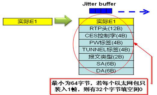 上圖是E1做PWE3的過程。按照標準中定義,在收到的E1數達到jitter buffer一半后,才向外發(fā)送。通常每ETH包中封裝4幀E1,如果jitter buffer配置為250us(各廠家正常配置一般為100us-4ms),單節(jié)點延時約為1ms。對于MSTP技術,E1 映射到VC12 延時小于50us,單節(jié)點時延約為100us。