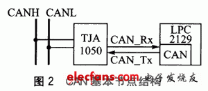 CAN節(jié)點(diǎn)硬件電路主要包括帶有CAN控制器的微控制器和用于數(shù)據(jù)收發(fā)的CAN收發(fā)器。本設(shè)計(jì)使用的是NXP公司的32位微控制器LPC2129,它帶有 CAN控制器,主要負(fù)責(zé)CAN的初始化和數(shù)據(jù)處理。CAN收發(fā)器種類有很多,本設(shè)計(jì)使用Philips公司的CAN高速收發(fā)器TJAl050。CAN基本節(jié)點(diǎn)結(jié)構(gòu)如圖2所示。